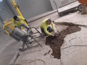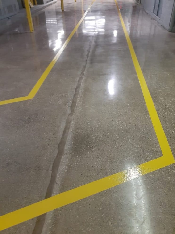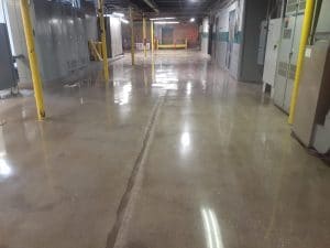 This heavily damaged hallway was causing daily traffic jams and disorganized work flow due to its condition. CustomCrete was brought in to repair the area after it was deemed too risky to completely remove the area due to sensitive equipment nearby. Our crews removed the damaged concrete, infilled with a mortar patch, and then polished the area. (To the best of ability while heavy patching!) At completion we added a safety yellow cart path to keep things organized and running smooth.