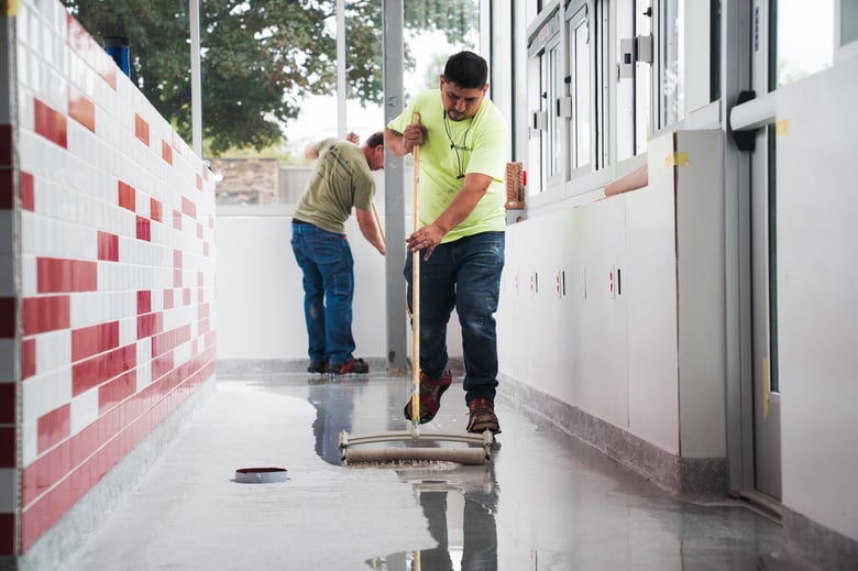 A trained epoxy installer uses mechanical mixers to blend the components thoroughly and prevent streaking or improper curing. Once mixed, the epoxy is poured onto the surface and spread using squeegees and rollers. Installers wear spike shoes so they can walk across the wet floor without disturbing the finish.