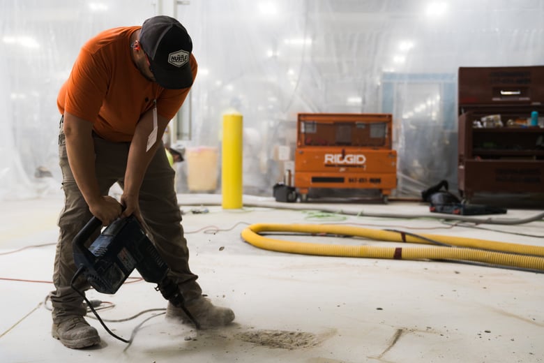 Floor demo involves risks such as flying debris, heavy lifting, dust inhalation, and potential exposure to chemicals in old adhesives. Professional crews are trained in OSHA safety practices and equipped with the right protective gear and dust containment systems, protecting both workers and the facility.